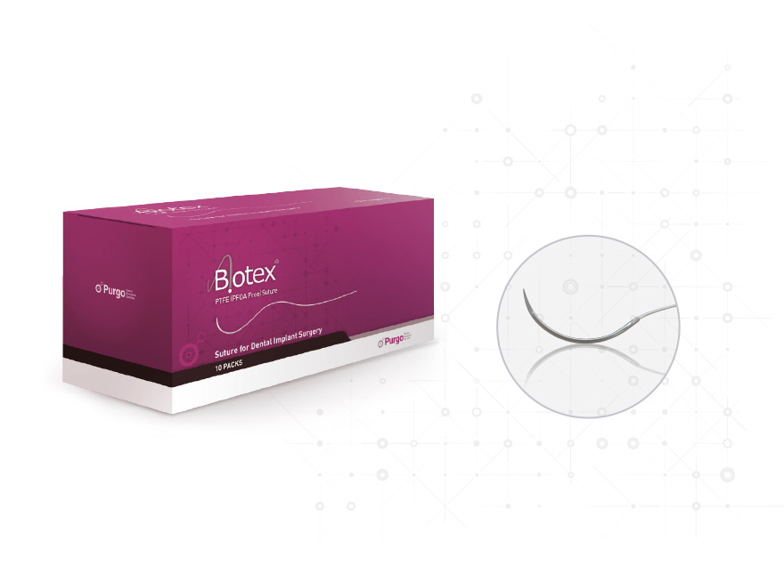 A Sutura de PTFE Não Reabsorvível Biotex® é constituída por uma sutura monofilamentar não reabsorvível de braço único com uma agulha cirúrgica de aço inoxidável ligada à sutura. A sutura é não revestida, não tingida e estéril para utilização única, composta por 100% PTFE.