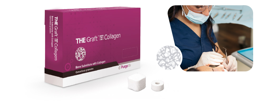 O bloco de Colagénio Graft™ é composto por matriz mineral óssea derivada de osso esponjoso e atelocolagénio de tendão porcino. O THE Graft™ Collagen é um enxerto ósseo destinado a preencher, aumentar e/ou reconstruir defeitos periodontais, orais e maxilofaciais. A matriz mineral óssea do THE Graft™ Collagen é semelhante aos aspetos físicos e químicos da matriz mineralizada do osso humano. Os componentes do colagénio hidratado têm uma viscosidade que facilita a mistura da matriz mineral óssea. Com esta caraterização, o colagénio THE Graft™ pode ser aparado e/ou moldado conforme as várias formas do defeito e pode ser fixado no local do defeito ósseo. Com o passar do tempo, o colagénio THE Graft™ é parcialmente transformado pelas células osteoclásticas e osteoblásticas.